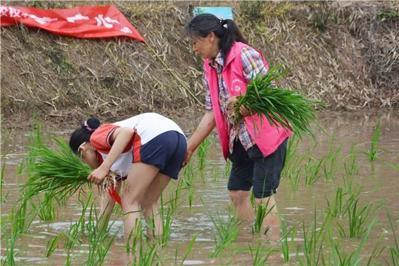 随后,孩子们在志愿者的指导下,立刻实践刚学的插秧技巧。巾帼志愿者们穿梭在田间,既当裁判又当指导员,及时纠正孩子们的插秧动作。